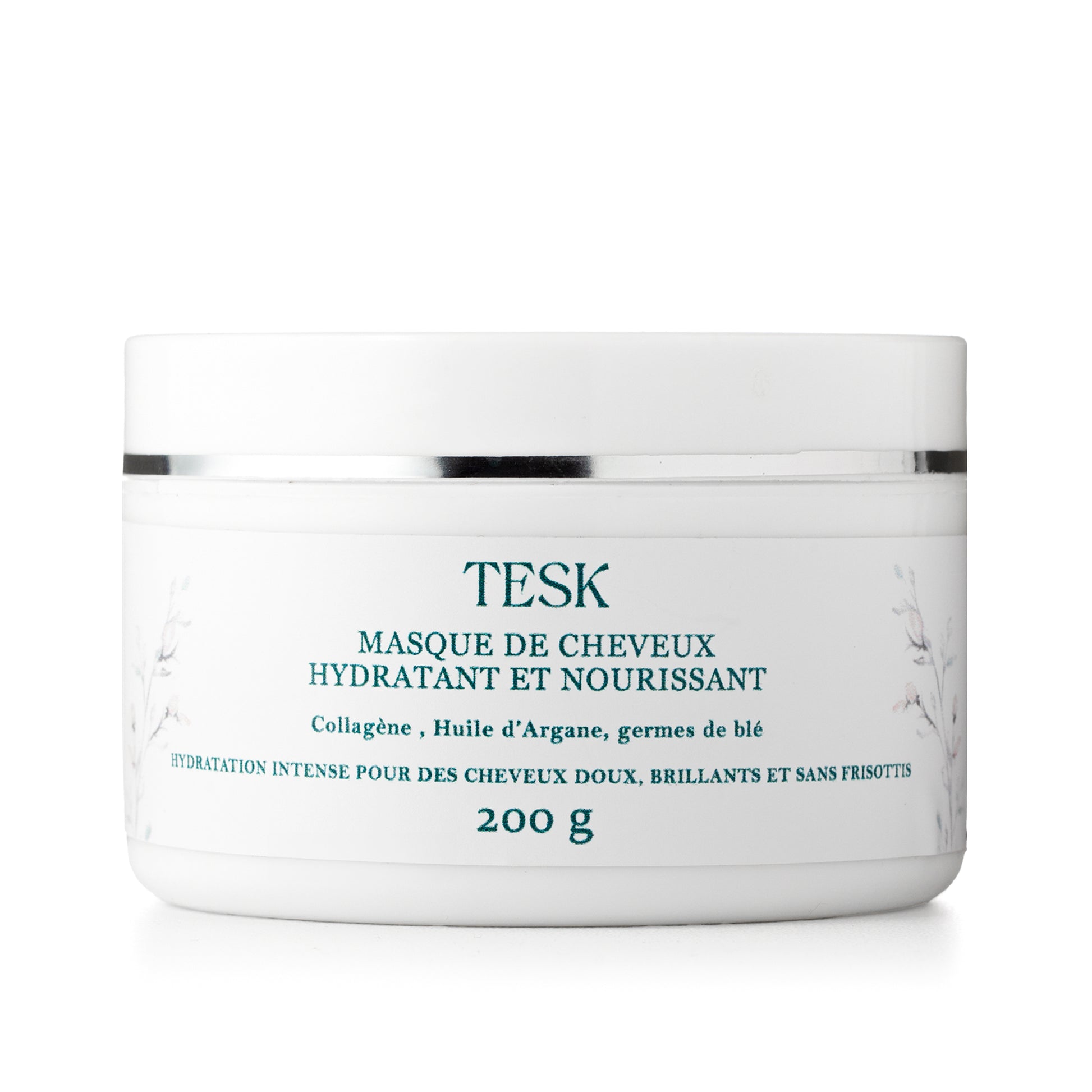 - La marque TESK présente un masque qui convient aux cheveux fragiles, cassants et abîmés. Le but du produit est de renforcer les cheveux, de les rendre plus épais et avec plus de volume. Le masque est enrichi en huile d'argan bio et en collagène.